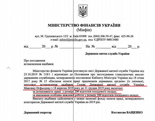 Голові митної служби Максиму Нефьодову погодили надбавки до зарплати в розмірі 300% окладу на 2020 рік.