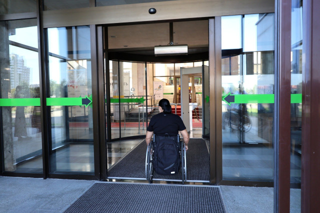 Зокрема, відсутня тактильна плитка на майданчику перед входом, сходи не мають контрастного маркування; турнікет у фойє занадто вузький для проїзду крісла колісного; санвузли та ліфти не відповідають вимогам безбар’єрності; пандус не має горизонтального продовження поручнів; на дверях бракує тактильних табличок та маркування шрифтом Брайля.