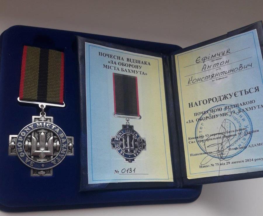 Нещодавно полеглого воїна Антона Костянтиновича Єфімчука посмертно нагороджено почесною відзнакою «За оборону міста Бахмута», повідомили в Боратинській громаді.