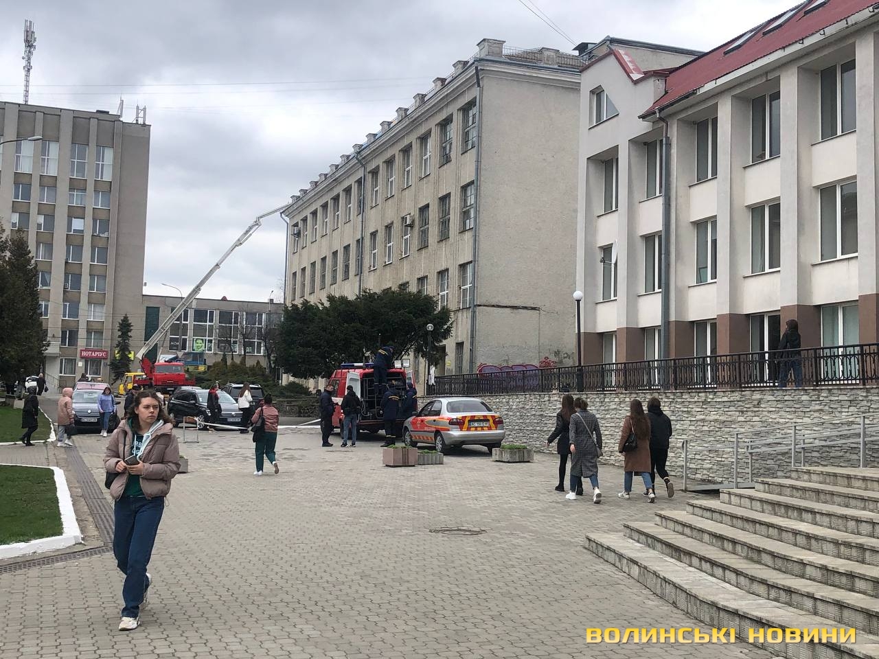 Дим з вікна, дві пожежні машини, швидка та поліція: у корпусах Волинського національного університету відпрацьовували дії під час пожежі.