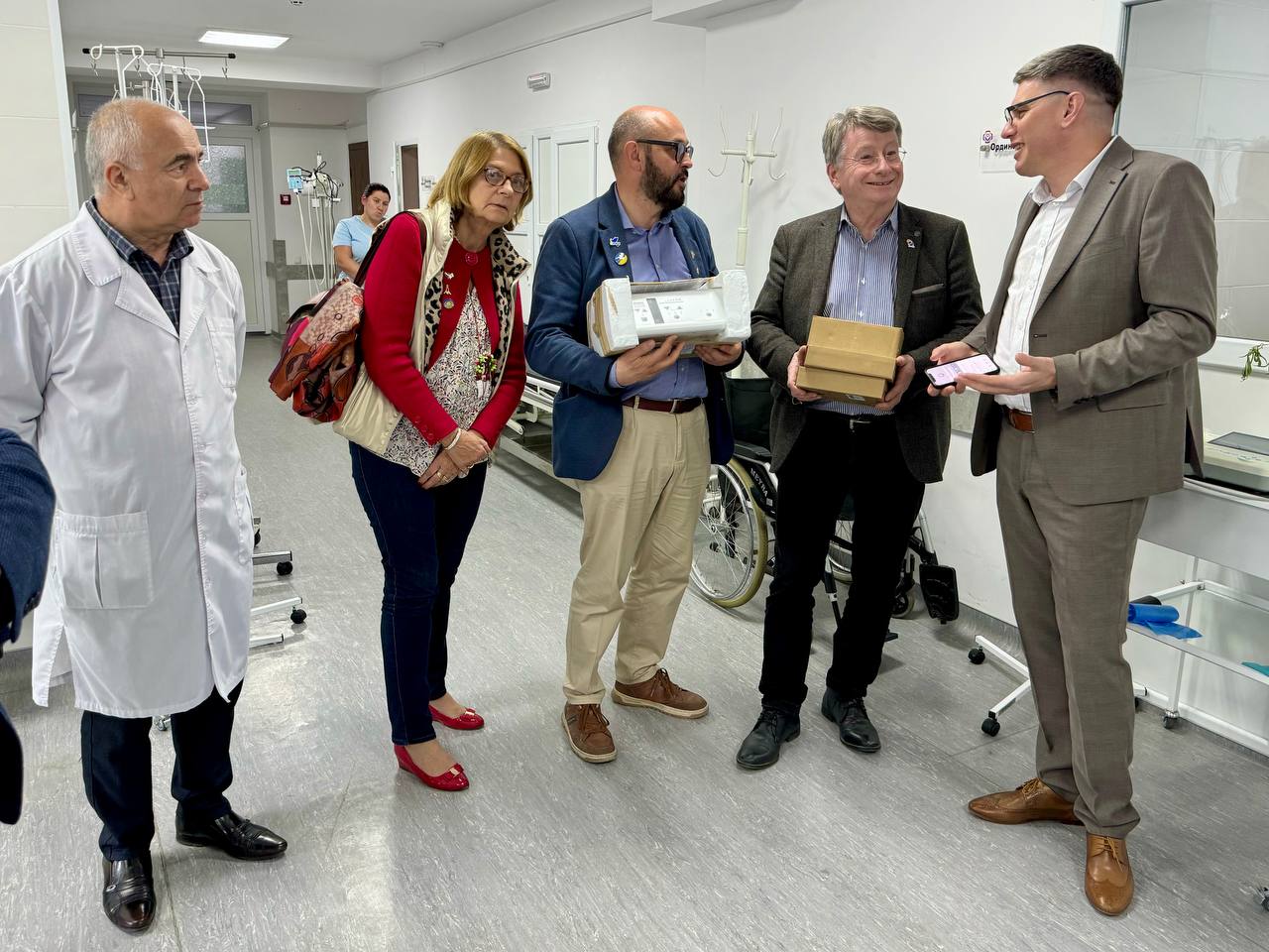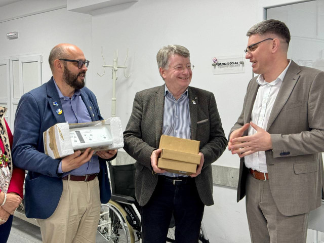 Кзавьє Пако, президент міжнародного комітету Ротарі-Франція-Україна з Катрін Фене, генеральним секретарем Ротарі-Париж-Франція та президентом ГО «Ротарі клуб «Київ-Бальзак» Володимиром Пилипенком презентували медустанові міста ультразвуковий апарат для електростимуляції.