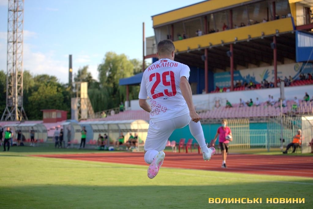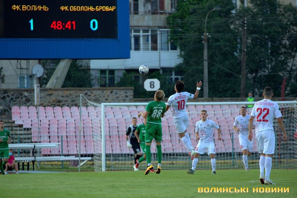 «Волинь», своєю чергою, намагалася атакувати через правий фланг, де активними були Сергій Сімінін з Денисом Кожановим. Обидві команди також мали моменти на стандартах – якщо волиняни лише вигравали верхові м’ячі у чужій штрафній, то під час одного з навісів після стандарту «Оболоні» в гру змушений був вступати Літовченко.Здавалося, що перша половина так і завершиться з нулями на табло, однак під час контратаки Ростислав Волошинович, який у сьогоднішньому матчі виконував роль центрфорварда, віддав розрізну передачу на Кожанова, а Денис пробив повз Федорівського – 1:0. Кожанов мав ще один момент до закінчення тайму, але пробив вище перекладини з-за меж карного майданчика.Другий тайм лучани вирішили розпочати обережно та грали на контратаках, в які вибігали атакувальні гравці «хрестоносців». Натомість «пивовари» намагалися підсилитися замінами, зокрема на поле вийшов Гутті, який замінив Ковбасу. Темношкірий гравець кілька разів накручував захист господарів та пробивав по воротах, але, на щастя, був неточним.