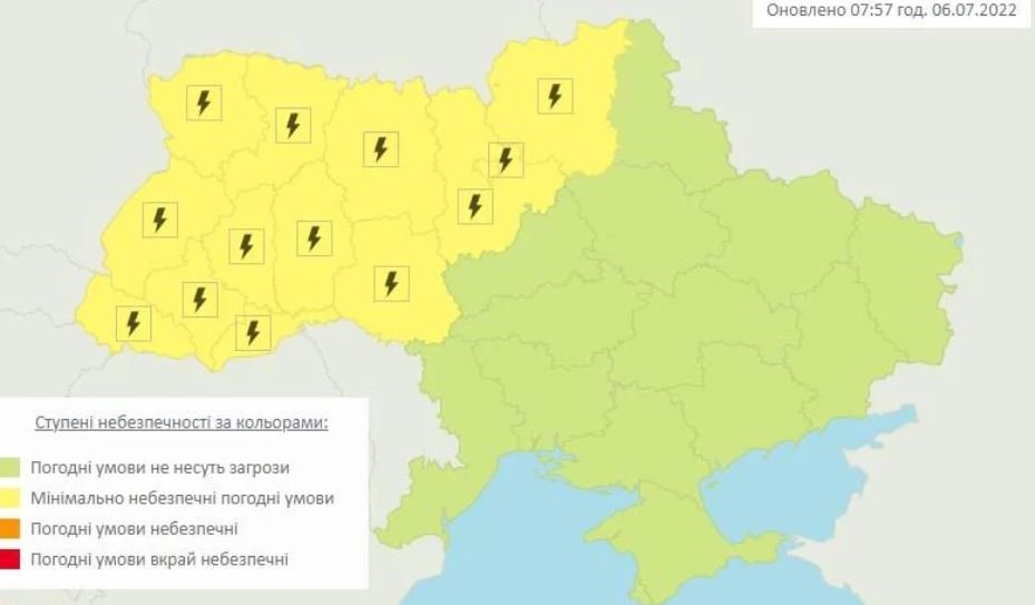 Як зазначається, у зазначених областях оголошено І рівень небезпечності, жовтий.