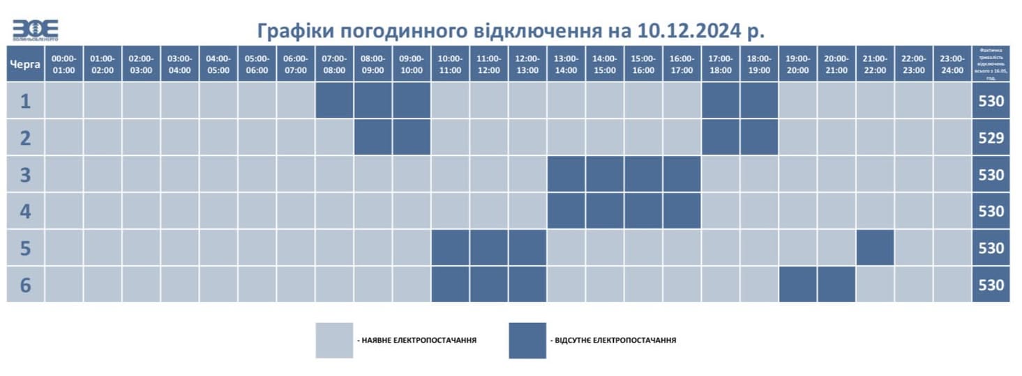 У вівторок, 10 грудня, у Волинській області діятимуть графіки погодинного відключення електроенергії. НЕК «Укренерго» встановило обмеження споживання електричної енергії на території області з 07:00 до 22:00.