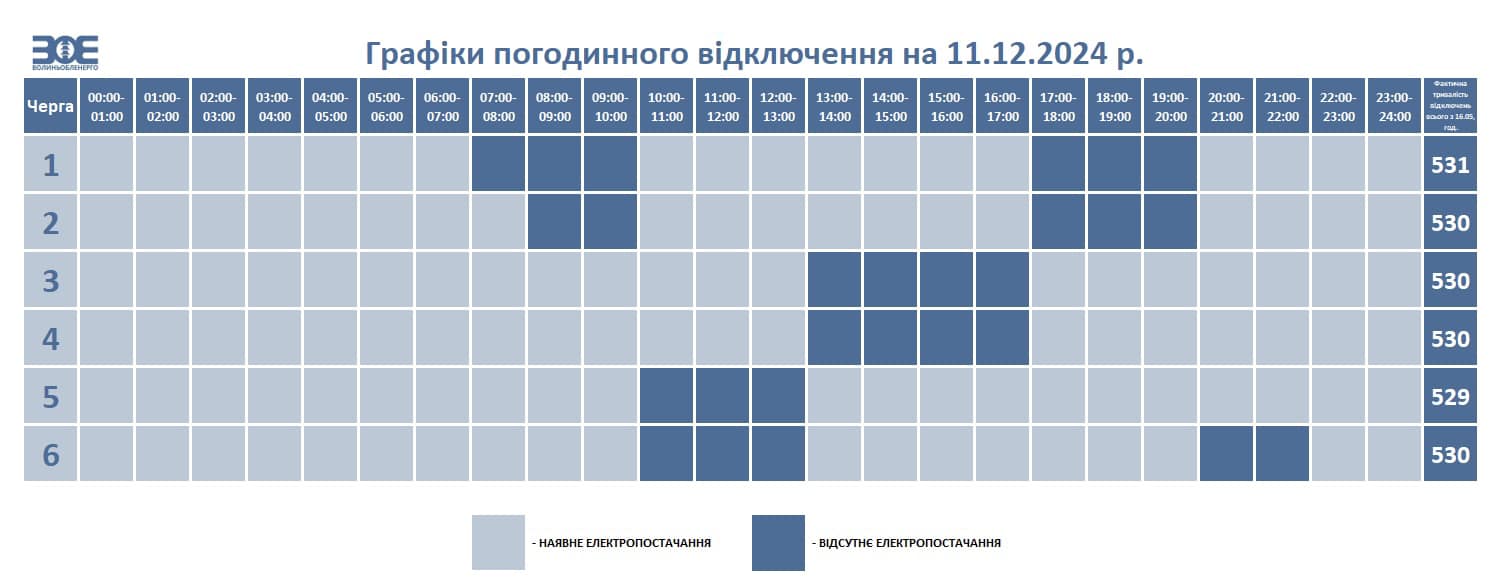 У середу, 11 грудня, у Волинській області діятимуть графіки погодинного відключення електроенергії. НЕК «Укренерго» встановило обмеження споживання електричної енергії на території області з 07:00 до 22:00.
