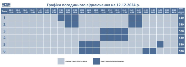 У четвер, 12 грудня, у Волинській області діятимуть графіки погодинного відключення електроенергії. НЕК «Укренерго» встановило обмеження споживання електричної енергії на території області з 07:00 до 22:00.