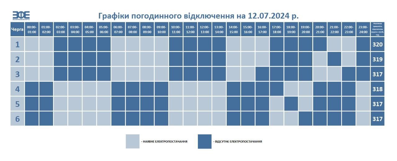 У п’ятницю, 12 липня, у Волинській області діятимуть графіки погодинного відключення електроенергії. НЕК «Укренерго» встановило обмеження споживання електричної енергії на території області з 00:00 до 24:00.