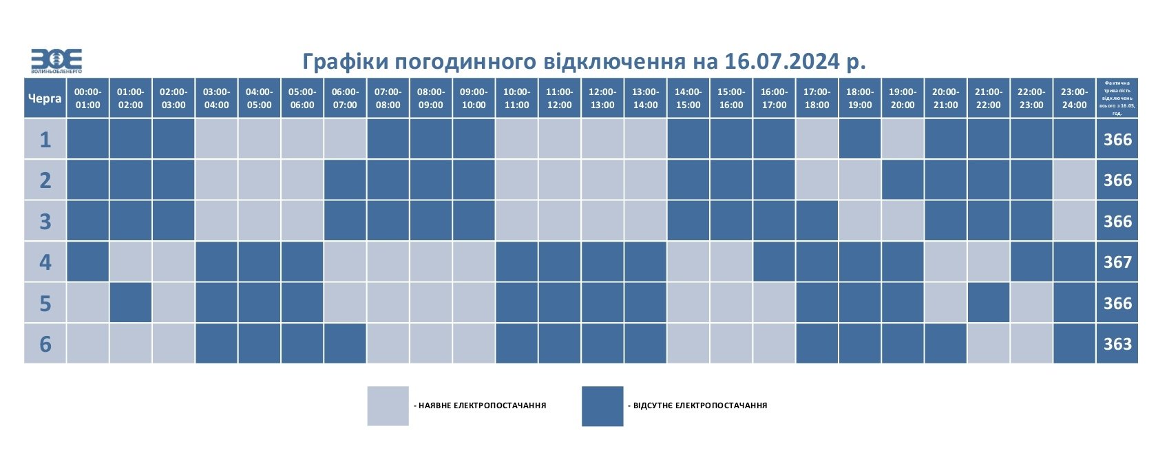 У вівторок, 16 липня, у Волинській області діятимуть графіки погодинного відключення електроенергії. НЕК «Укренерго» встановило обмеження споживання електричної енергії на території області з 00:00 до 24:00.