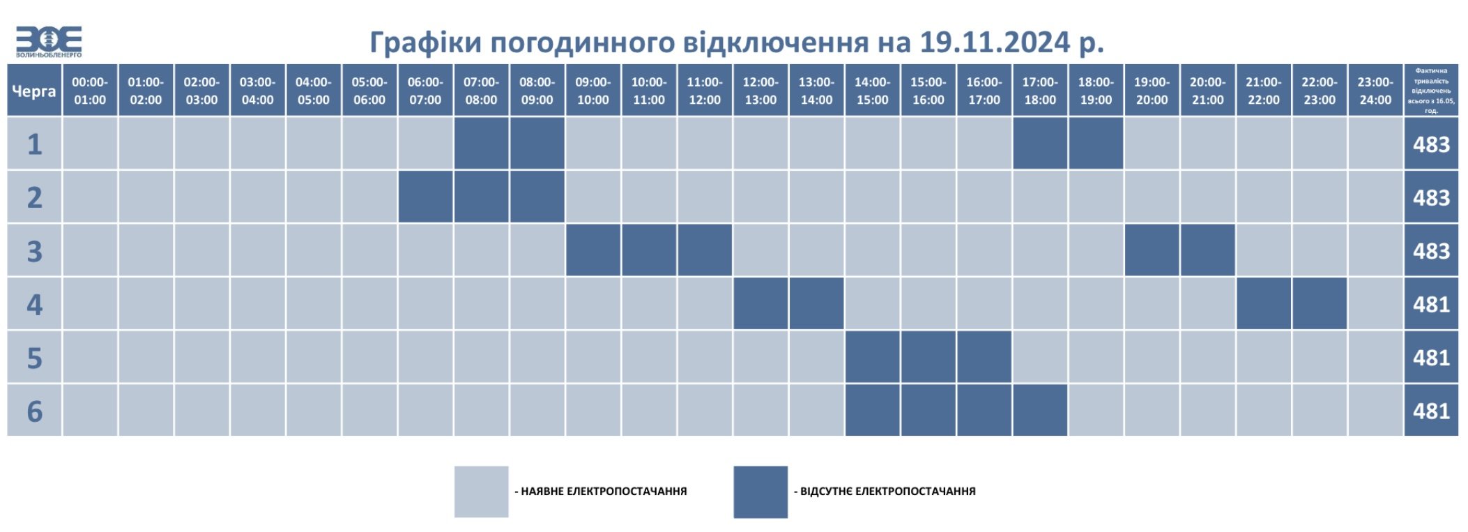 У вівторок, 19 листопада, у Волинській області діятимуть графіки погодинного відключення електроенергії. НЕК «Укренерго» встановило обмеження споживання електричної енергії на території області з 06:00 до 23:00.