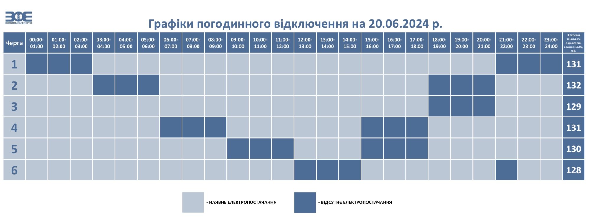 У четвер, 20 червня, у Волинській області діятимуть графіки погодинного відключення електроенергії (ГПВ). НЕК «Укренерго» встановило ліміт споживання електричної енергії на території області з 00:00 до 24:00.