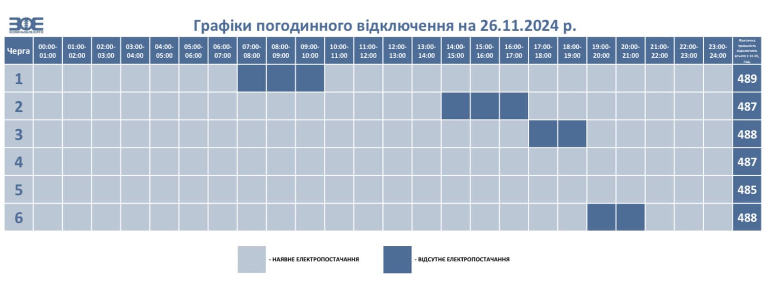 У вівторок 26 листопада у Волинській області діятимуть графіки погодинного відключення електроенергії. НЕК «Укренерго» встановило обмеження споживання електричної енергії на території області з 07:00 до 10:00 та з 14:00 до 21:00.