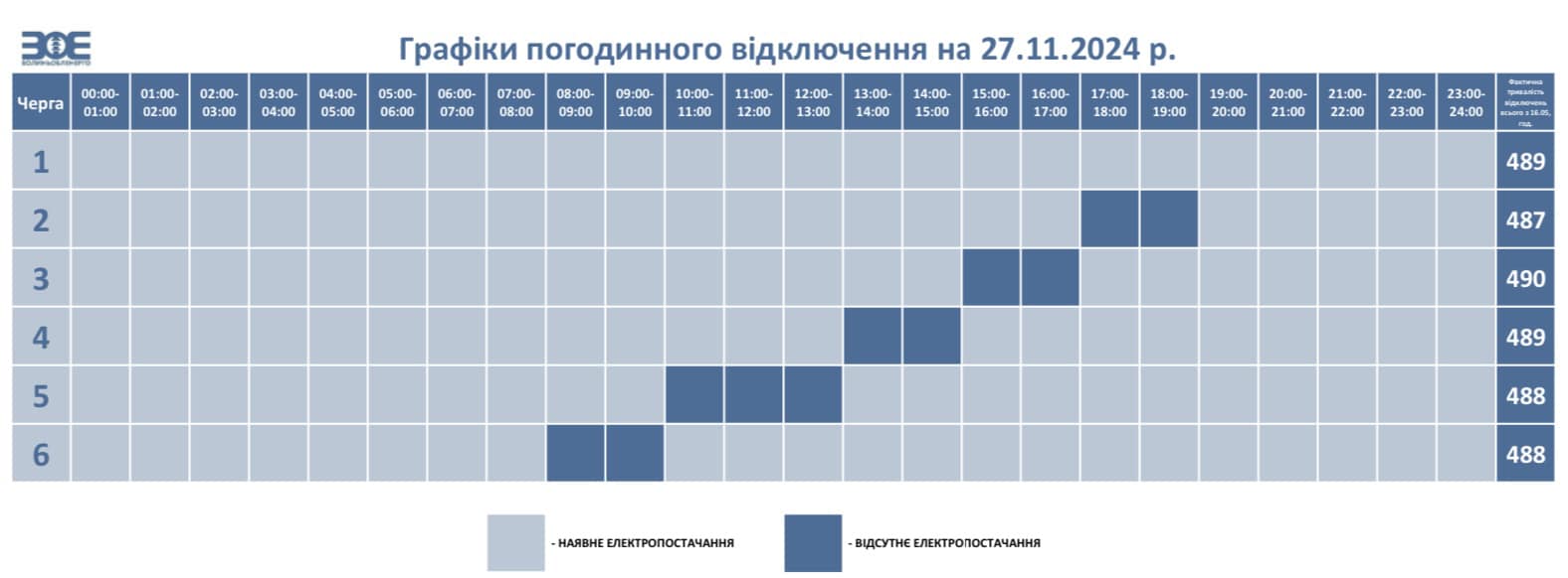У середу, 27 листопада, у Волинській області діятимуть графіки погодинного відключення електроенергії. НЕК «Укренерго» встановило обмеження споживання електричної енергії на території області з 08:00 до 19:00.