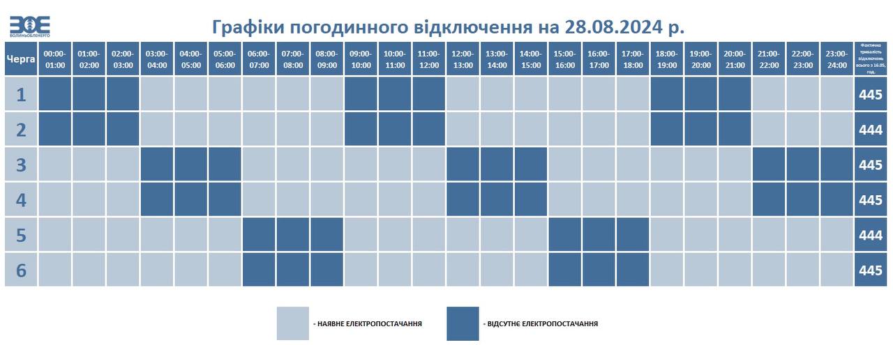 У середу 28 серпня у Волинській області діятимуть графіки погодинного відключення електроенергії.