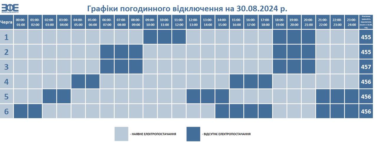 У п‘ятницю 30 серпня у Волинській області діятимуть графіки погодинного відключення електроенергії.