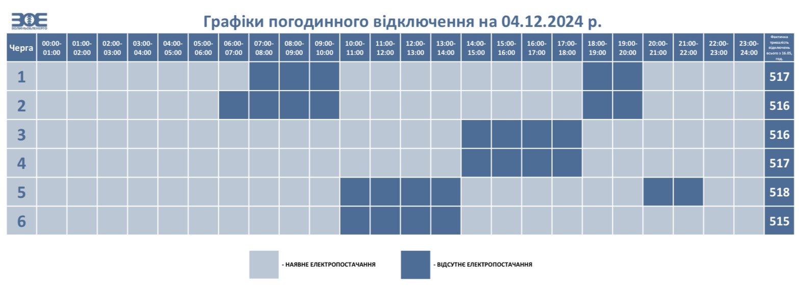 У середу, 4 грудня, у Волинській області діятимуть графіки погодинного відключення електроенергії. НЕК «Укренерго» встановило обмеження споживання електричної енергії на території області з 06:00 до 22:00.