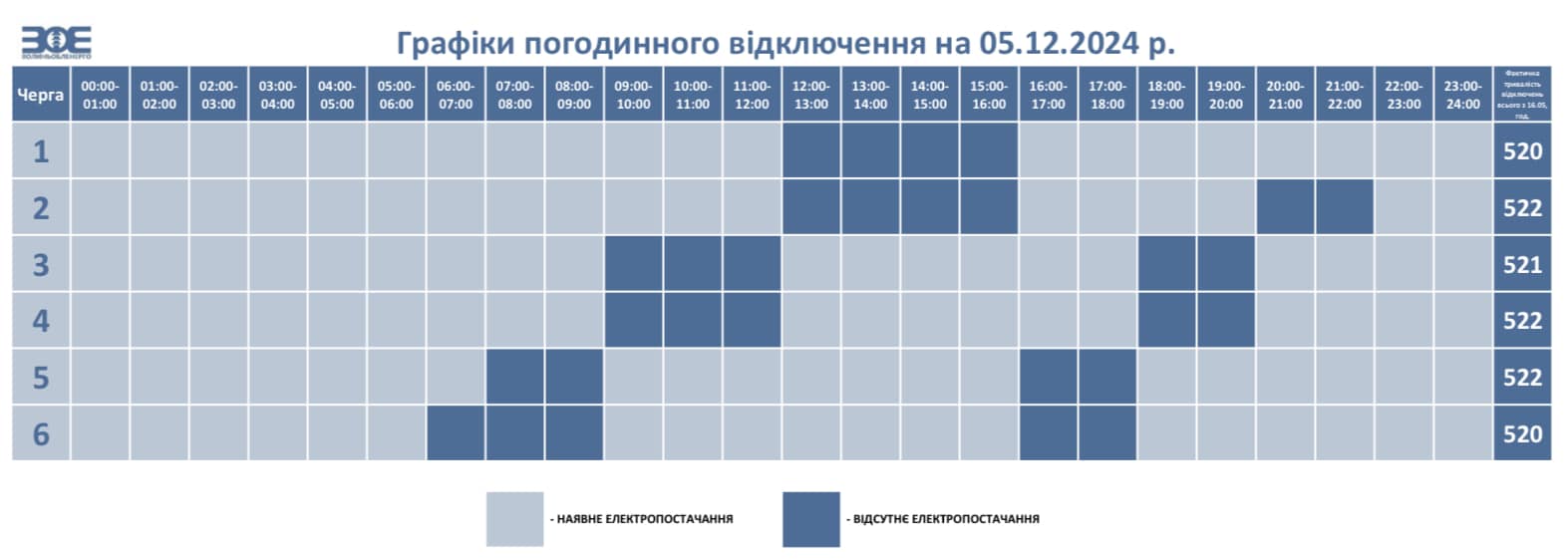 У четвер, 5 грудня, у Волинській області діятимуть графіки погодинного відключення електроенергії. НЕК «Укренерго» встановило обмеження споживання електричної енергії на території області з 06:00 до 22:00.