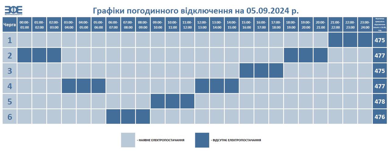У четвер, 5 вересня, у Волинській області діятимуть графіки погодинного відключення електроенергії. НЕК «Укренерго» встановило обмеження споживання електричної енергії на території області з 00:00 до 24:00.