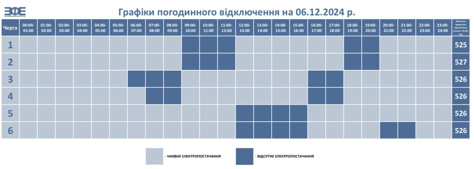 У п'ятницю, 6 грудня, у Волинській області діятимуть графіки погодинного відключення електроенергії. НЕК «Укренерго» встановило обмеження споживання електричної енергії на території області з 06:00 до 22:00.