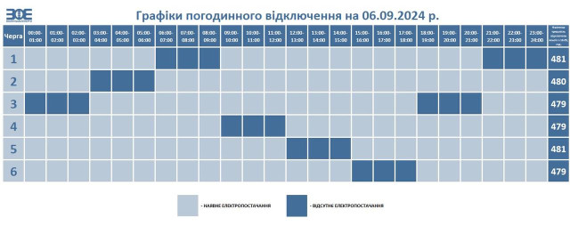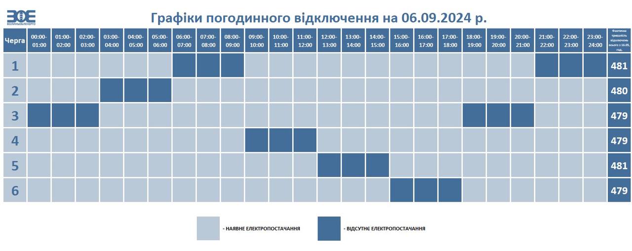 У п'ятницю, 6 вересня, у Волинській області діятимуть графіки погодинного відключення електроенергії. НЕК «Укренерго» встановило обмеження споживання електричної енергії на території області з 00:00 до 24:00.