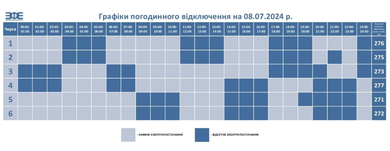 У понеділок, 8 липня, у Волинській області діятимуть графіки погодинного відключення електроенергії. НЕК «Укренерго» встановило обмеження споживання електричної енергії на території області з 00:00 до 24:00.