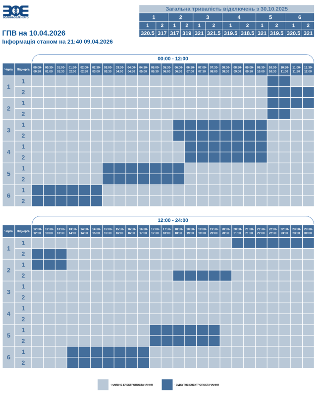 Час відключення та відновлення електропостачання може відрізнятись від заявленого у графіку на 20-30 хвилин. Таке відхилення пов'язане із технологічним процесом перемикання черг службами «Волиньобленерго».