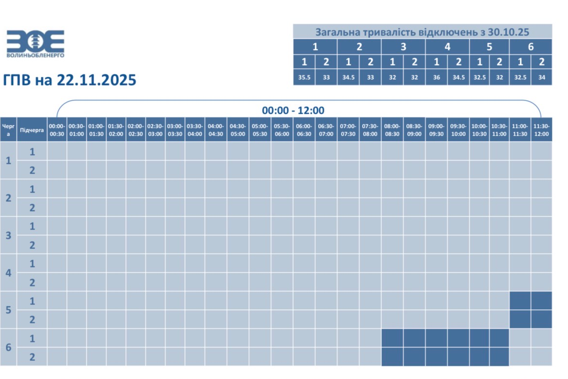 Час відключення та відновлення електропостачання може відрізнятись від заявленого у графіку на 20-30 хвилин. Таке відхилення пов’язане із технологічним процесом перемикання черг службами «Волиньобленерго».