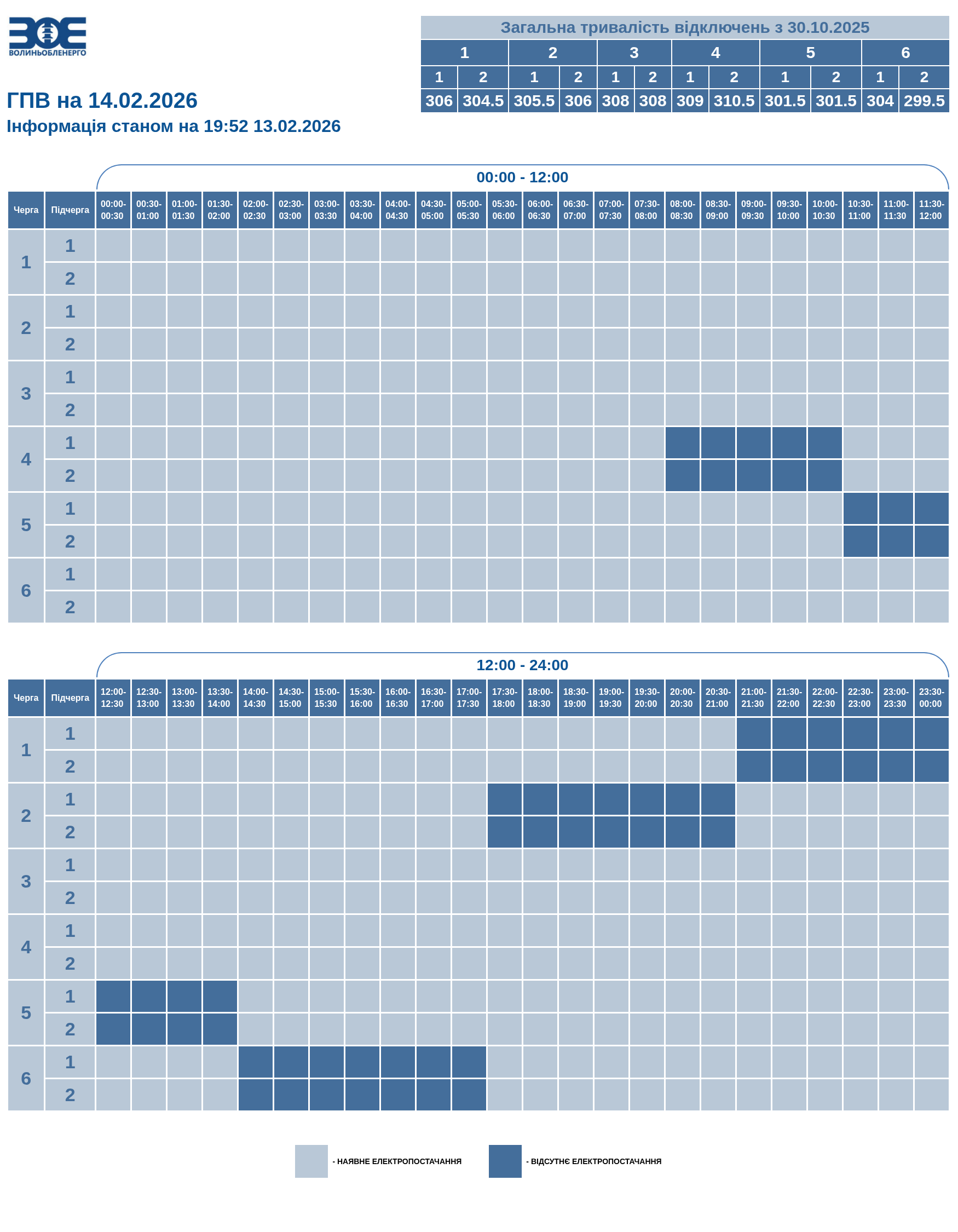 Час вимкнення та відновлення електропостачання може відрізнятись від заявленого у графіку на 20-30 хвилин. Таке відхилення пов'язане із технологічним процесом перемикання черг службами «Волиньобленерго».