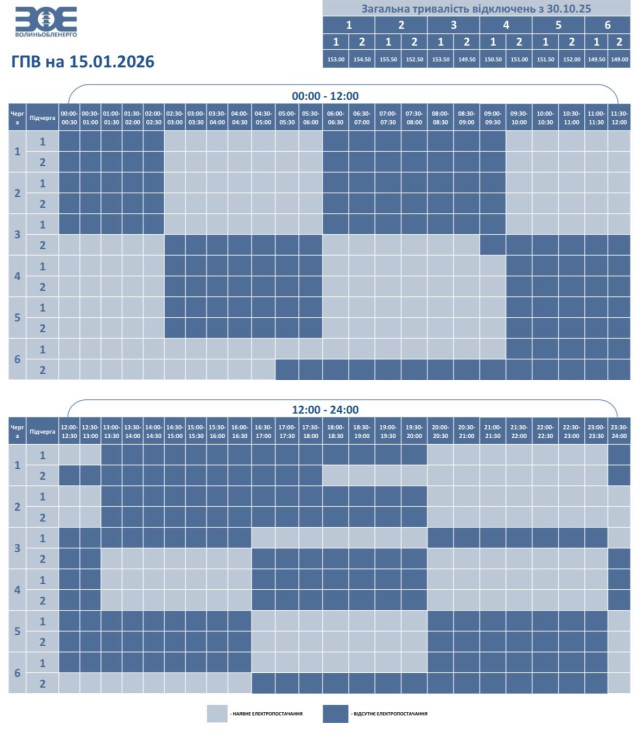 Час вимкнення та відновлення електропостачання може відрізнятись від заявленого у графіку на 20-30 хвилин. Таке відхилення пов'язане із технологічним процесом перемикання черг службами «Волиньобленерго».