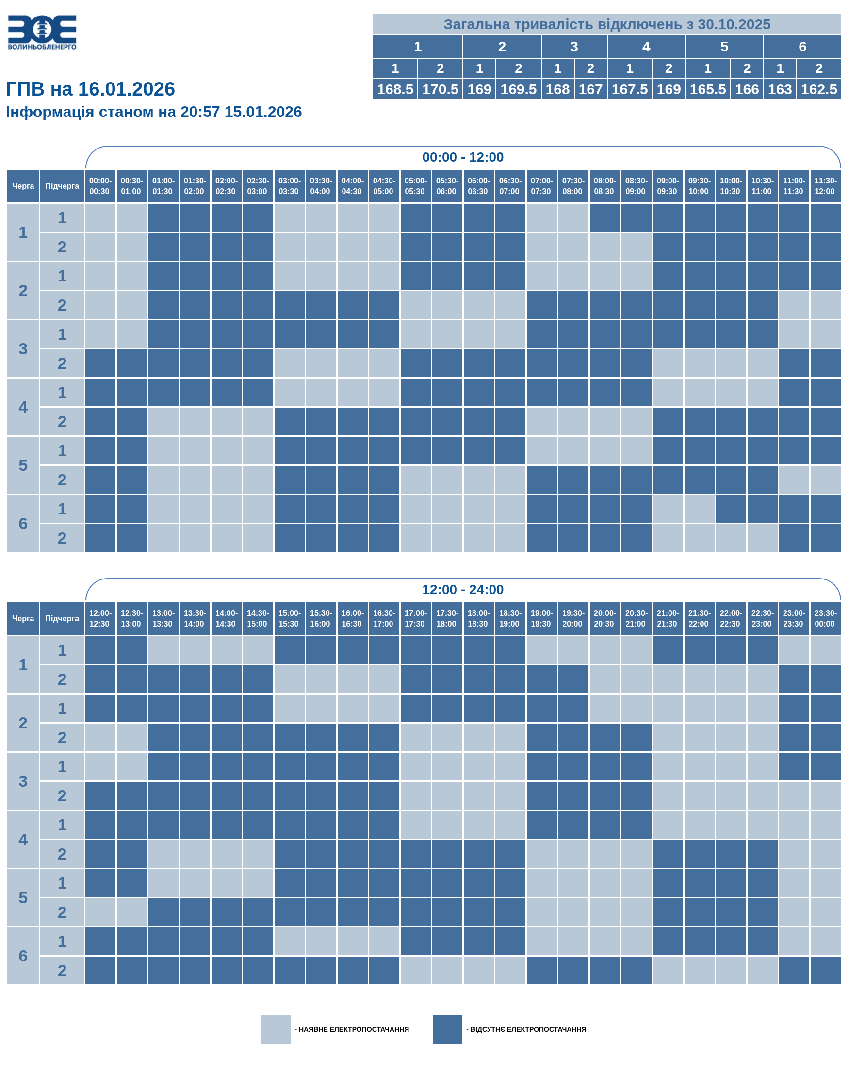 Час вимкнення та відновлення електропостачання може відрізнятись від заявленого у графіку на 20-30 хвилин. Таке відхилення пов'язане із технологічним процесом перемикання черг службами «Волиньобленерго».