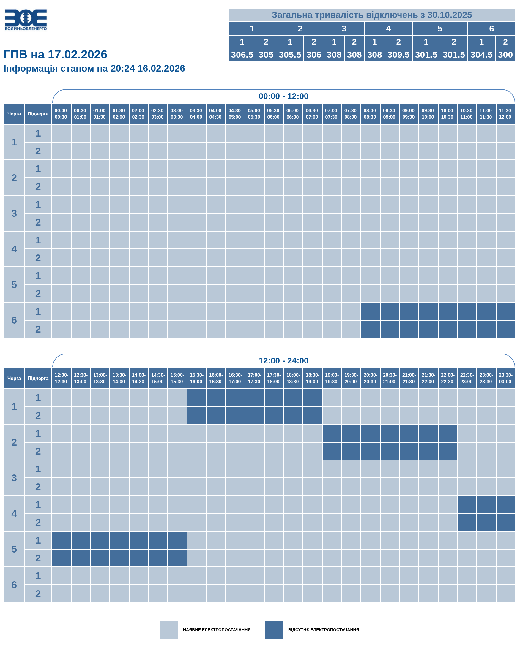 Час вимкнення та відновлення електропостачання може відрізнятись від заявленого у графіку на 20-30 хвилин. Таке відхилення пов'язане із технологічним процесом перемикання черг службами «Волиньобленерго».