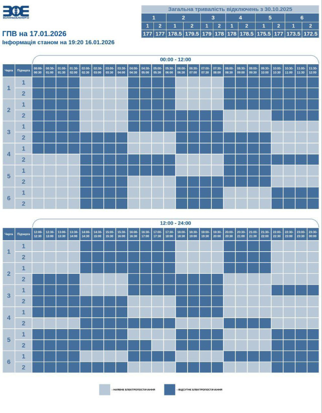 Час вимкнення та відновлення електропостачання може відрізнятись від заявленого у графіку на 20-30 хвилин. Таке відхилення пов'язане із технологічним процесом перемикання черг службами «Волиньобленерго».
