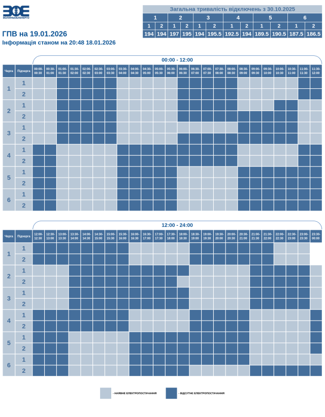 Час вимкнення та відновлення електропостачання може відрізнятись від заявленого у графіку на 20-30 хвилин. Таке відхилення пов'язане із технологічним процесом перемикання черг службами «Волиньобленерго».