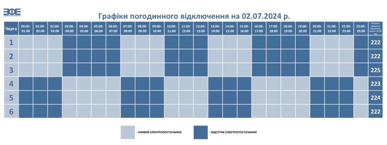 У вівторок, 2 липня, у Волинській області діятимуть графіки погодинного відключення електроенергії. НЕК «Укренерго» встановило обмеження споживання електричної енергії на території області з 00:00 до 24:00.