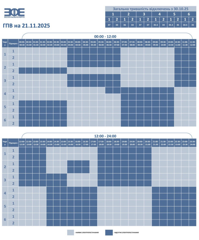 Час відключення та відновлення електропостачання може відрізнятись від заявленого у графіку на 20-30 хвилин. Таке відхилення пов’язане із технологічним процесом перемикання черг службами «Волиньобленерго».