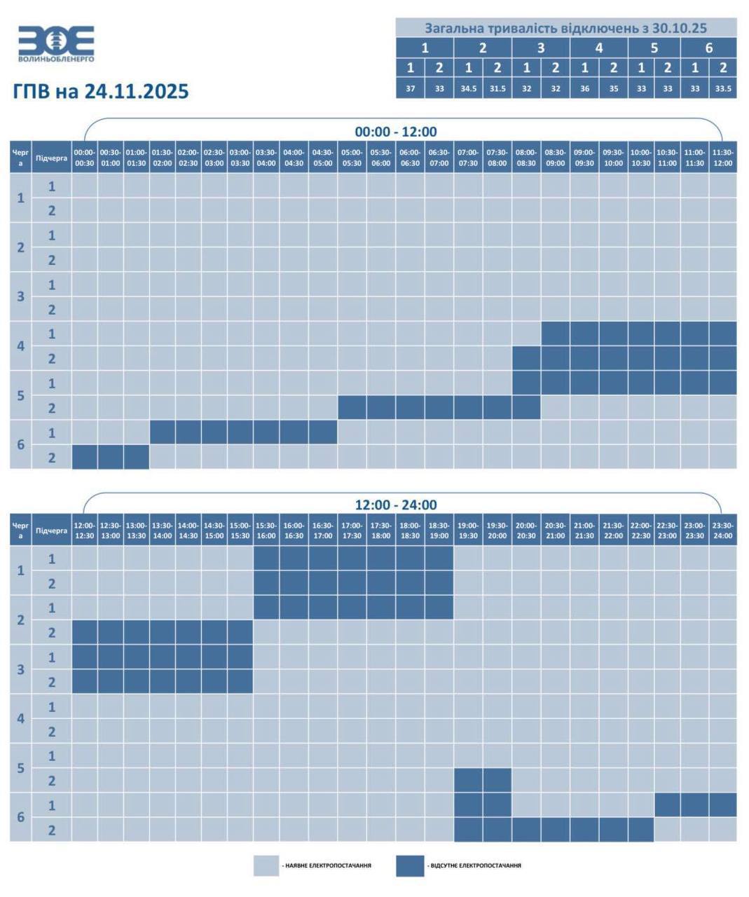 Час відключення та відновлення електропостачання може відрізнятись від заявленого у графіку на 20-30 хвилин. Таке відхилення пов’язане із технологічним процесом перемикання черг службами «Волиньобленерго».
