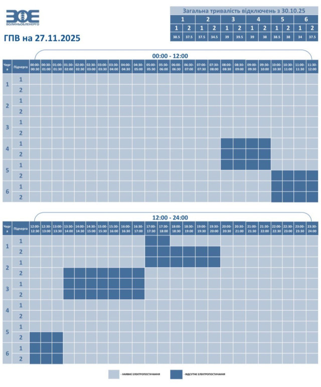 Час відключення та відновлення електропостачання може відрізнятись від заявленого у графіку на 20-30 хвилин. Таке відхилення пов’язане із технологічним процесом перемикання черг службами «Волиньобленерго».