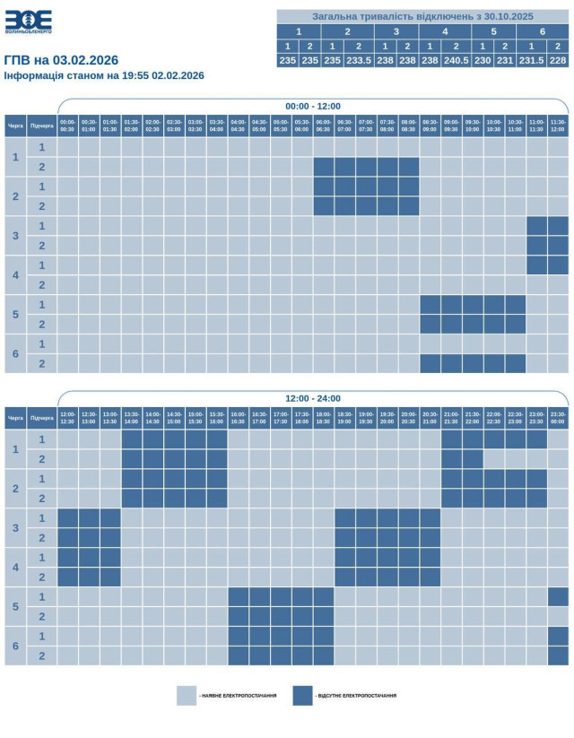 Час вимкнення та відновлення електропостачання може відрізнятись від заявленого у графіку на 20-30 хвилин. Таке відхилення пов'язане із технологічним процесом перемикання черг службами «Волиньобленерго».