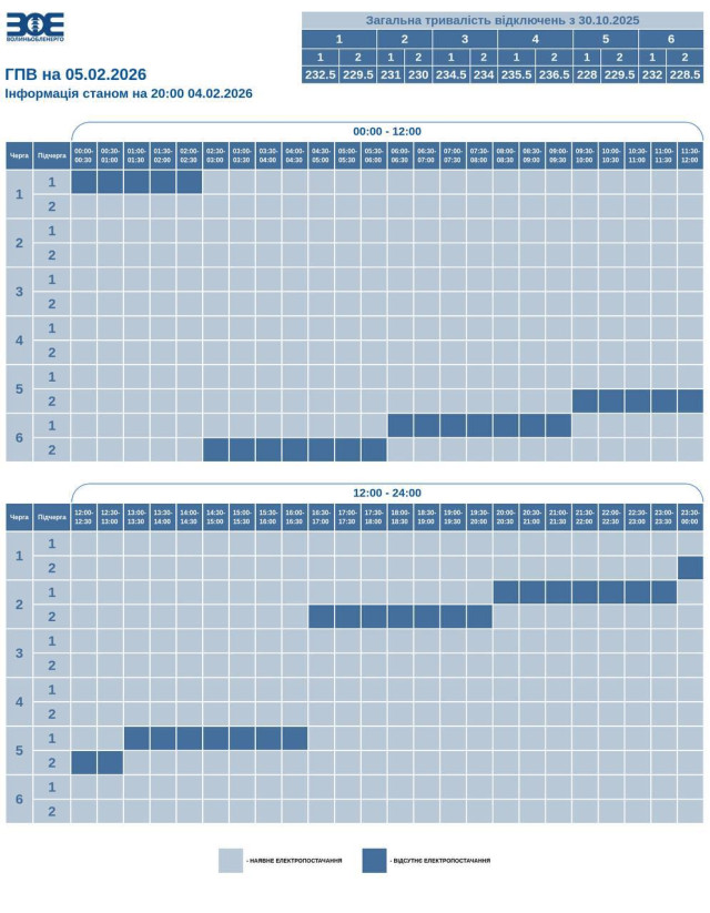 Час вимкнення та відновлення електропостачання може відрізнятись від заявленого у графіку на 20-30 хвилин. Таке відхилення пов'язане із технологічним процесом перемикання черг службами «Волиньобленерго».