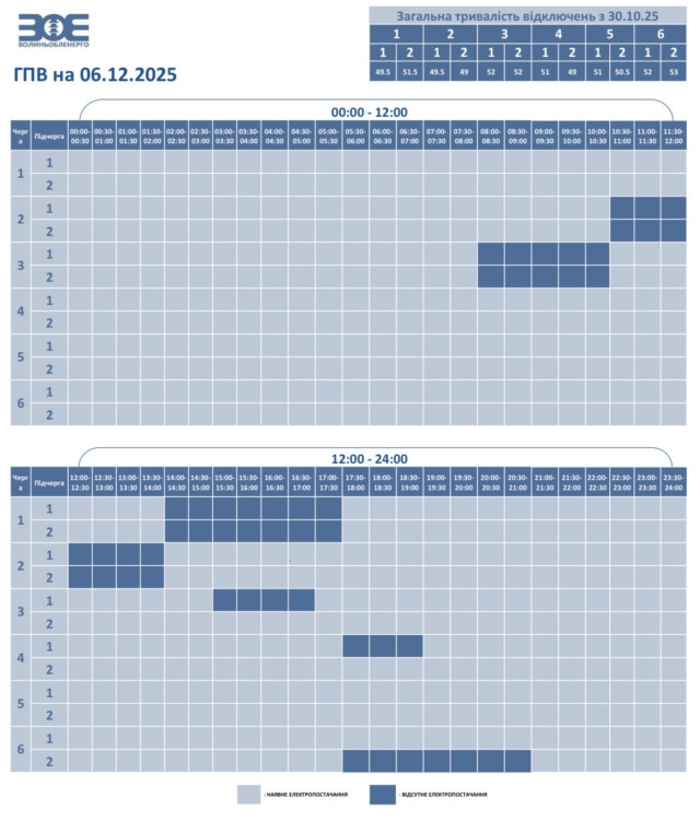 Час відключення та відновлення електропостачання може відрізнятись від заявленого у графіку на 20-30 хвилин. Таке відхилення пов’язане із технологічним процесом перемикання черг службами «Волиньобленерго».