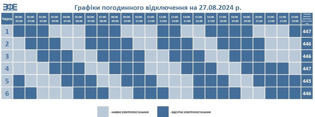 У вівторок, 27 серпня, у Волинській області діятимуть графіки погодинного відключення електроенергії. НЕК «Укренерго» встановило обмеження споживання електричної енергії на території області з 00:00 до 24:00.