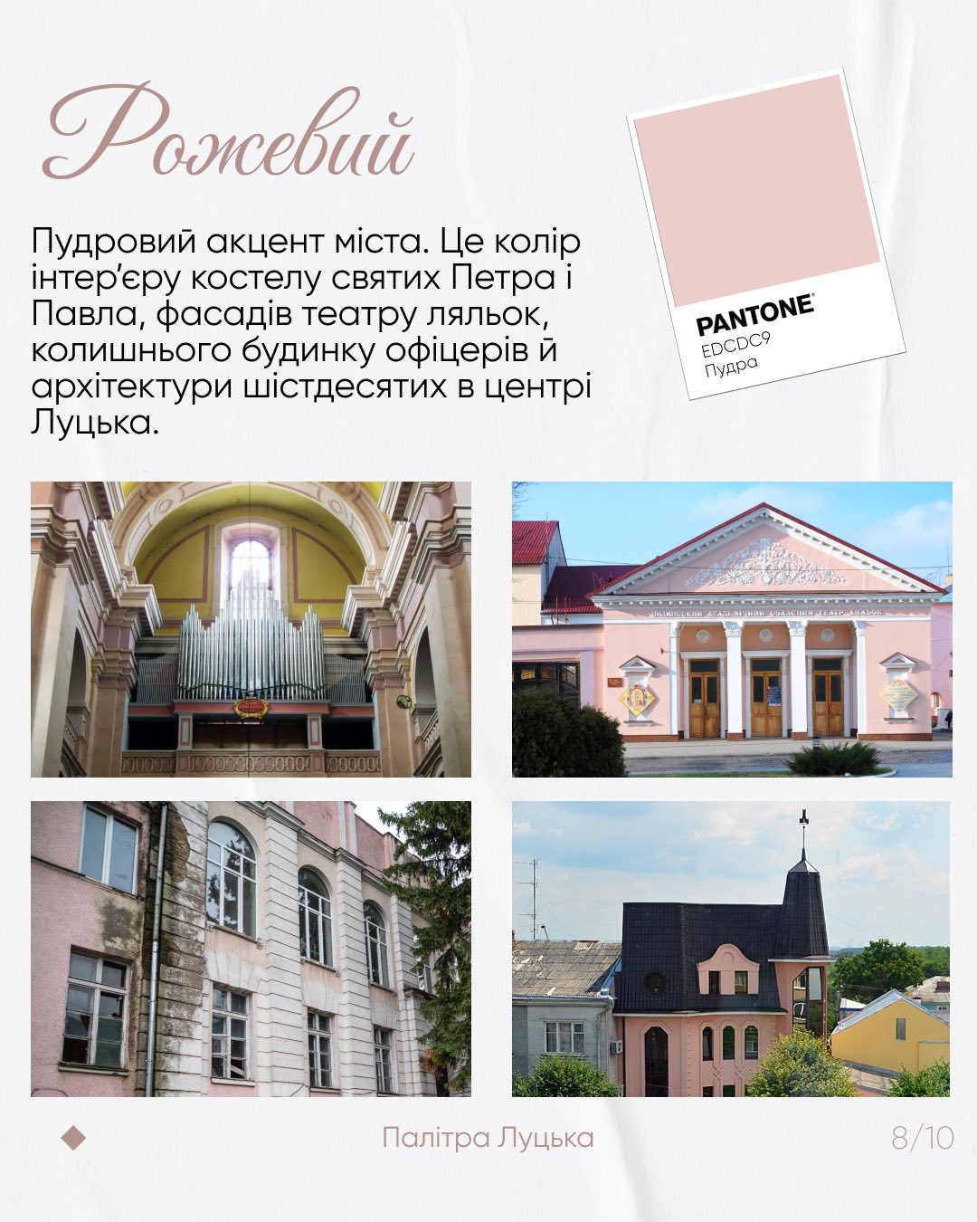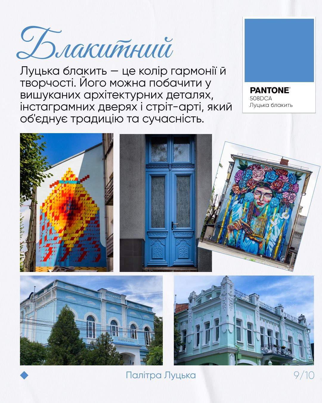 Серед кольорів Луцька – цегляно-жовтий, гранітовий, сакральний білий, смарагдово-зелений, монументально-сірий, теракотовий, рожевий, блакитний.