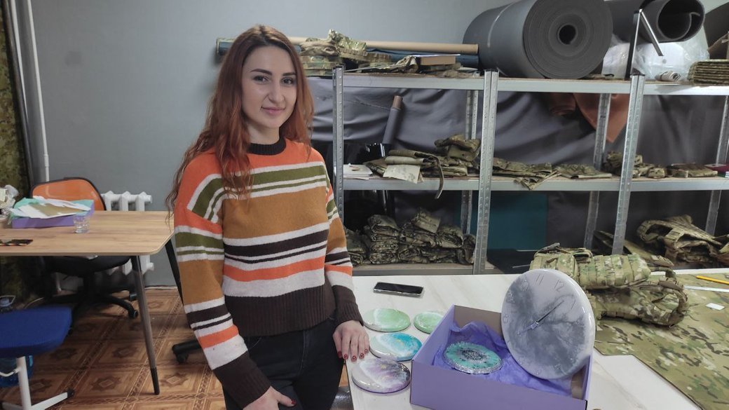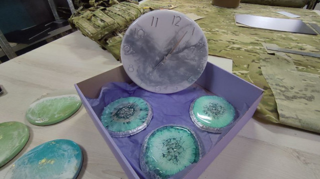 Окрім спорядження, переселенка також виготовляє підставки та годинники з епоксидної смоли. Майстерня, де жінка буде створювати свої вироби на продаж, зараз у процесі облаштування.«Епоксидна смола – це такий, можна сказати, дуже міцний клей. Це ось просто підставочка під гаряче, під вашу чашечку», – показує виріб.