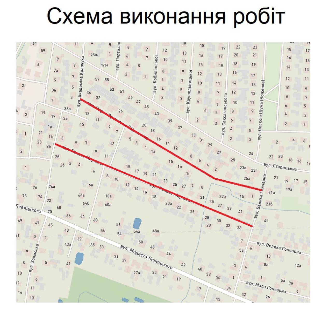 Там проведуть наступні роботи: фрезерування покриттів, ямковий ремонт асфальтобетонного покриття доріг, ліквідація вибоїн, розливання бітумної емульсії, улаштування вирівнювального шару з асфальтобетонної суміші, заміна цегляних горловин оглядових каналізаційних колодязів на залізобетонні, улаштування дорожніх корит, улаштування тротуарів.