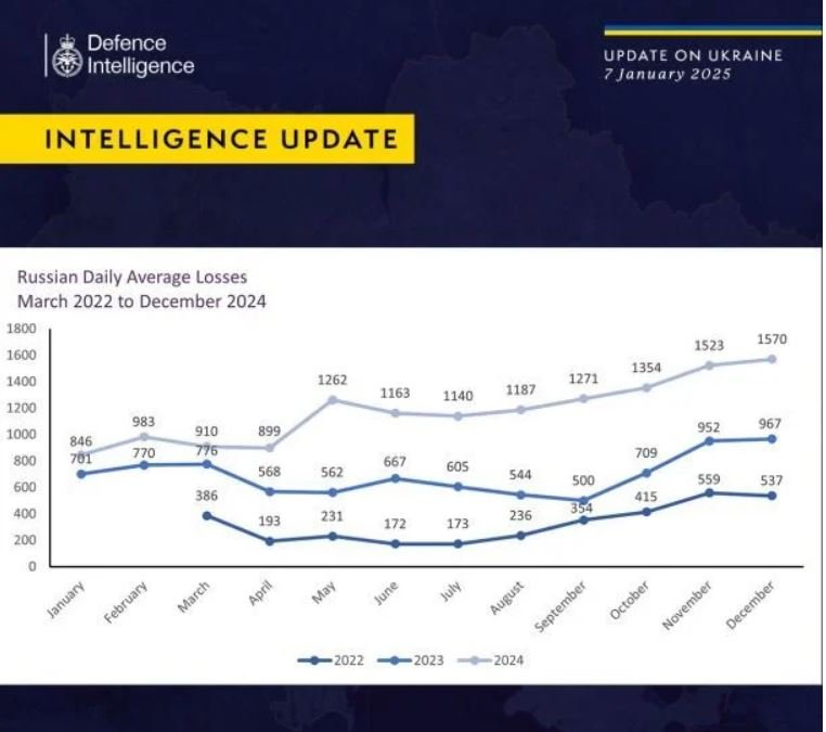 У середньому щоденні втрати російської армії в грудні становили 1570 осіб, що є новим рекордом війни. Найбільший добовий показник був зафіксований 19 грудня, коли Росія втратила 2200 військових. Загалом, у 2024 році російські війська втратили 429 660 військових, що значно перевищує показник 2023 року – 252 940 осіб. Від початку війни загальні втрати РФ, за даними Генерального штабу України, перевищують 790 000 військових.Британська розвідка пояснює такі втрати численними піхотними атаками, які Росія здійснює на кількох напрямках фронту. На думку експертів, високий рівень втрат, найімовірніше, збережеться й у січні 2025 року через продовження наступальних дій.