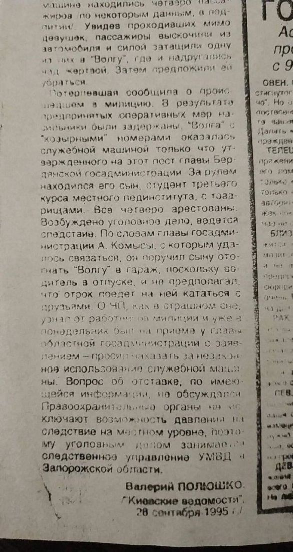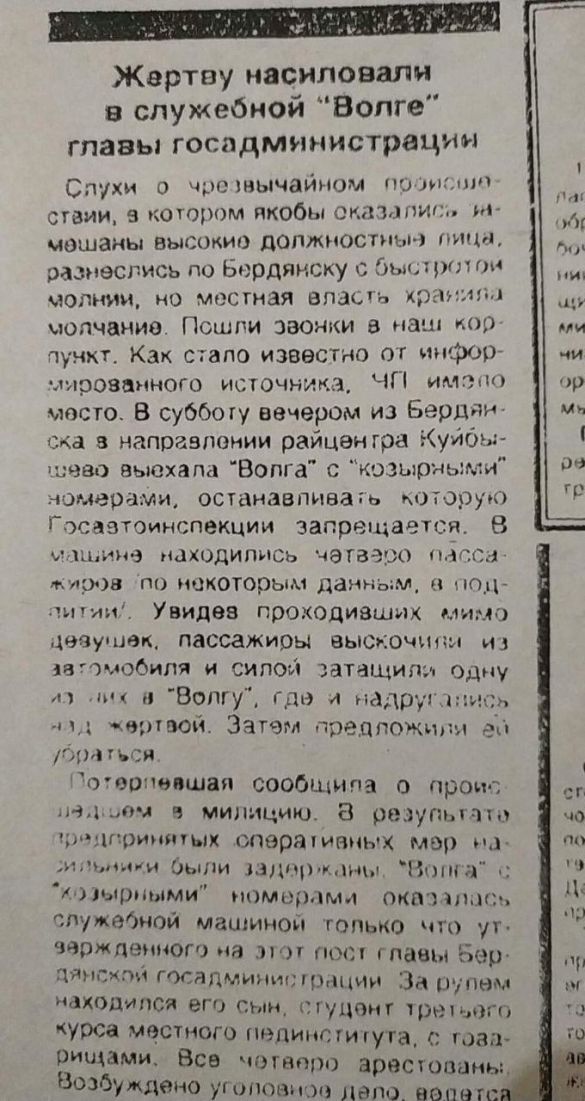 «В машині було четверо людей – двом, здається, по 16 років і двом по 19, здається. Їх було четверо, серед них був син мера Бердянська [виявилося, що це був син голови районної адміністрації – ТСН], прізвище я вже не пригадаю. Справу вели запорізькі слідчі, саме з Запоріжжя, тому що в Куйбишеві в нас все хотіли зам’яти. У мене десь є вирізка з газети, де написано приблизно «жертву ґвалтували у мерській Волзі». Всі у Куйбишеві про це знали, в мене тут плювали», – розповіла жінка.«Всі четверо отримали різні терміни, і жоден не відсидів свій термін повністю. Тому, що вони до мене приїздили по черзі кожного дня, дзвонили, тероризували. Через цей тиск я писала якісь прохання, щоб їх відпустили. Це був такий жах, я так прагнула все забути, що зараз все повністю не згадаю. Мені і роботу довелось змінити через це, і багато інших неприємностей пережила», – поділилася жертва.