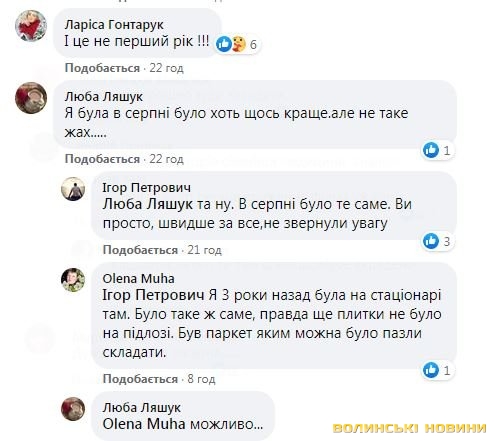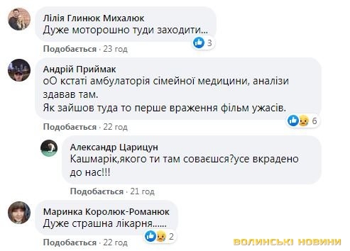 Вибирають і перебирають їх у всілякі органи.. І жодного мужика серед них нема, який би помінявся своїм кабінетом з лабораторією», – йдеться у дописі.У коментарях користувачі розповідають, що такий стан приміщення вже не перший рік та зазначають, що у ветиринарних клініках значно кращі умови.Сьогодні під час засідання комісії з питань використання майна спільної власності територіальних громад, сіл, селищ, міст району депутати районної ради рекомендували провести незалежний аудит фінансового та господарського стану Рожищенського районного центру ПМСД, йдеться на сайті Луцької райради.