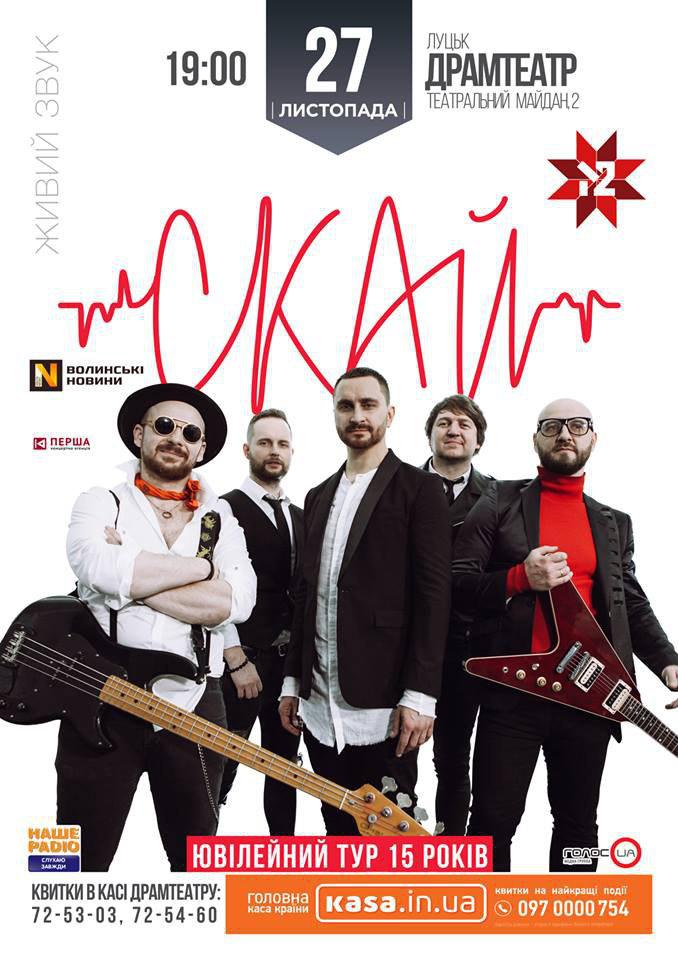 У рамках всеукраїнського туру, присвяченого 15-річчю, популярний гурт СКАЙ дасть концерт у Луцьку. Виступ відбудеться 27 листопада о 19 годині у облмуздрамтеатрі.