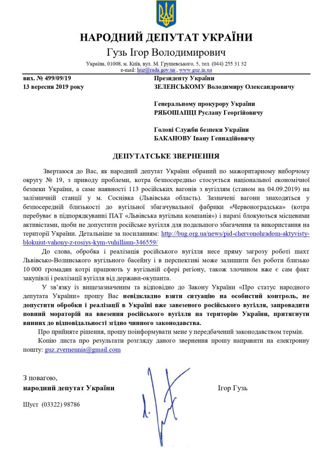 Депутат Верховної Ради Ігор Гузь офіційно звернувся до глави держави, Генпрокурора та керівника СБУ з приводу присутності російського вугілля в Україні. У запиті йдеться, що 113 російських вагонів з вугіллям (станом на 04.09.2019), які перебувають на залізничній станції у місті Соснівка Львівської області, порушують національну економічну безпеку.