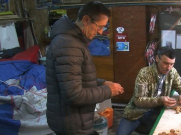 У майстерні чоловіки б’ють волоські горіхи та лущать арахіс.«Це інгредієнти, які мають високу енергетичну цінність та поживні речовини, необхідні воїнам», – говорить керівниця гуртків Інна Кравчук. Додає: кладуть таке, що дає можливість і перекусити, і коли воїни сушку смокчуть, то вони втамовують спрагу.