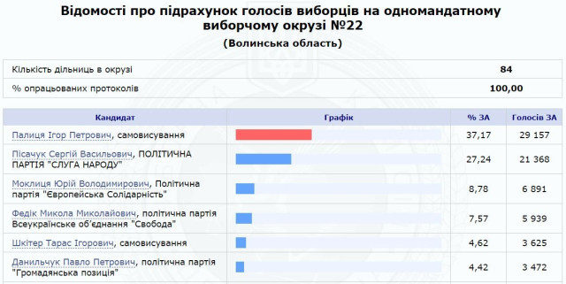 Так, за результатами підрахунків, представляти Луцьк у Верховній Раді буде Палиця Ігор Петрович, який набрав 37,17%.